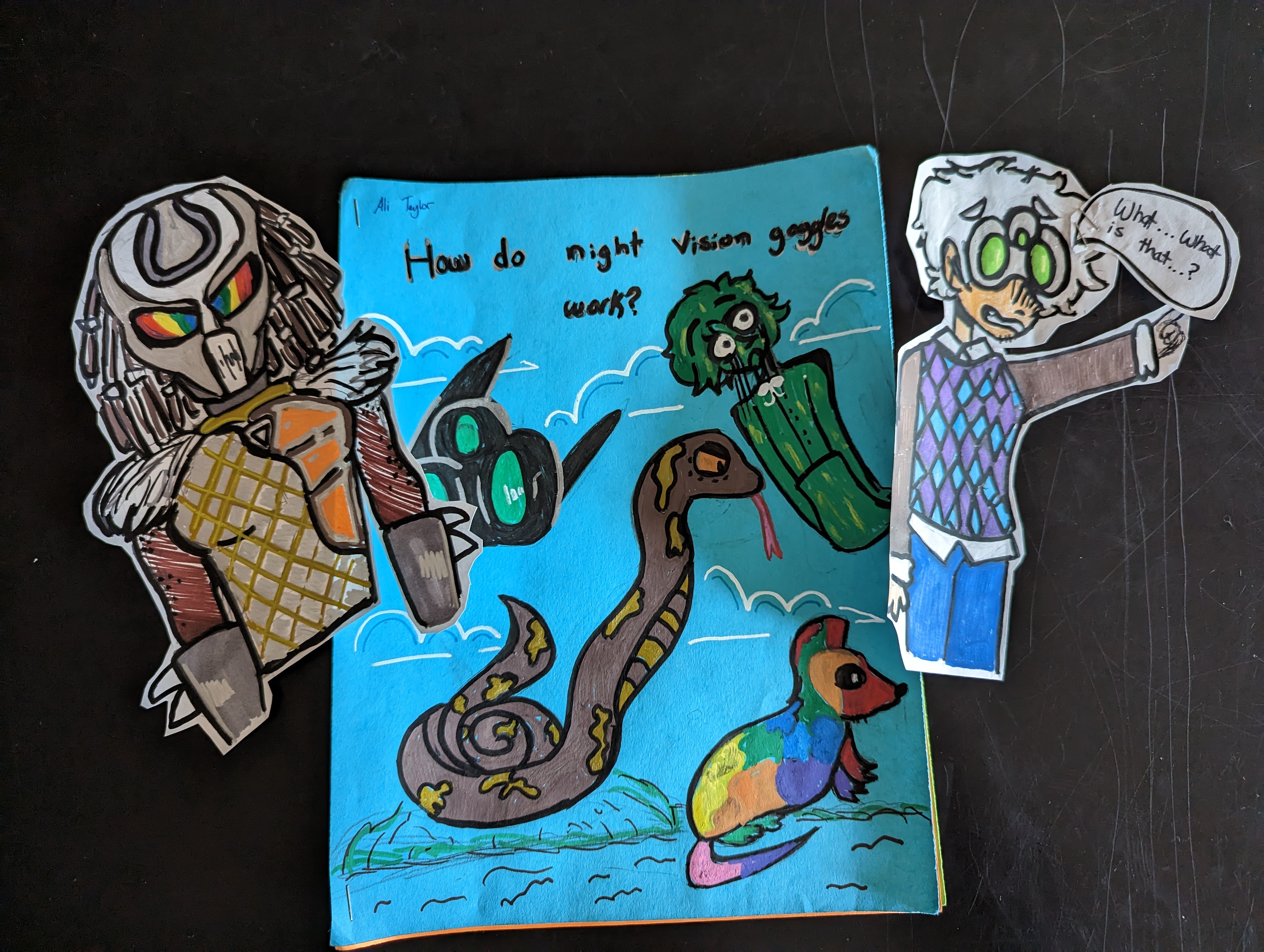 For example- when tasked to create an explanatory model that represents their understanding of the Electromagnetic Spectrum, I knew that one student was an aspiring animator. So, during our Model Consultation, I asked them if they could think of a connection between the passion for art, and the EM Spectrum. After a few moments, they asked if they could use two characters that explain how night vision goggles work. What I received was not only a model that met each of the Learning Targets, but a model that made extensions into nature (ex. bees, snakes) that mirror the collection of wavelengths to create images. This step beyond happened because they “got on a roll, wanting to have a real-life connection, so my characters seem real.” When we had a class Gallery Walk, the evident pride in their work sparked a lot of praise and deeper discussions into the topic that did not have to be prompted by me.